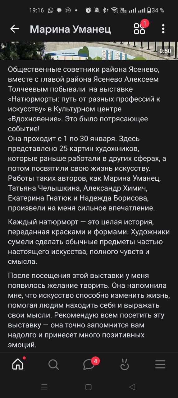 С 10 по 30 января 2025 года в культурном центре «Вдохновение» ЮЗАО проходит групповая выставка «Натюрморты: путь от разных профессий к искусству», которая стала ярким событием в культурной жизни района Ясенево. На выставке представлены работы талантливых и перспективных художников: Марины Уманец, Александра Химича и др.